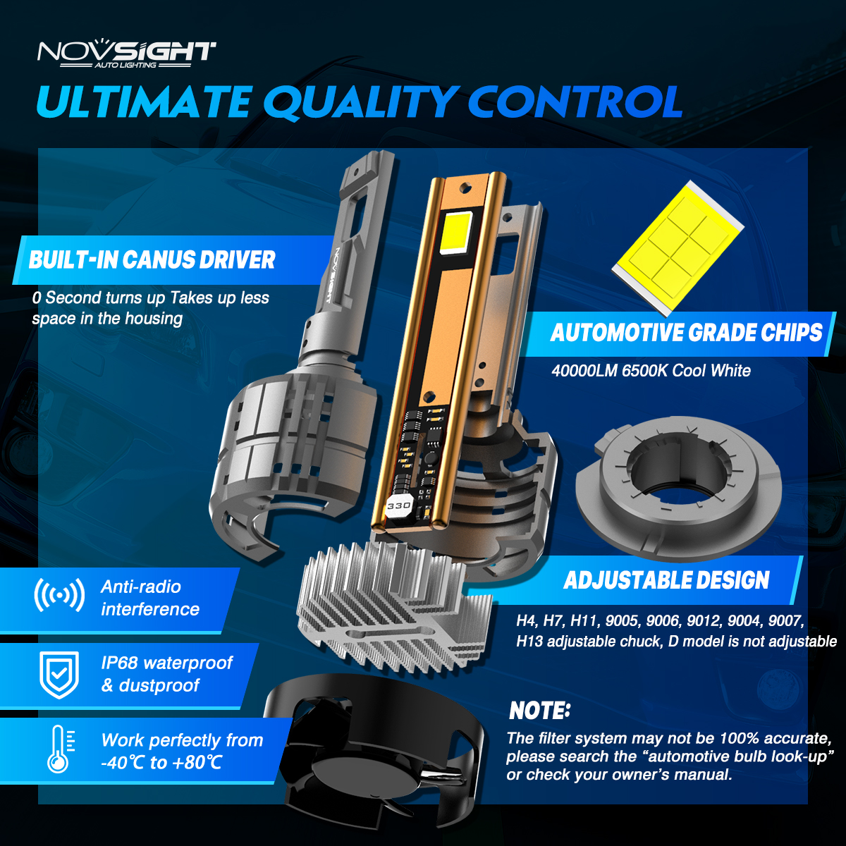 • Novsight N60 LED bulbs feature advanced lighting technology, 200 watts, 40,000 lumens of light output, giving you 900% of the light output. The brightest alternative to halogen bulbs..