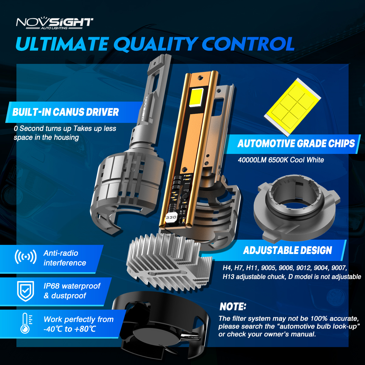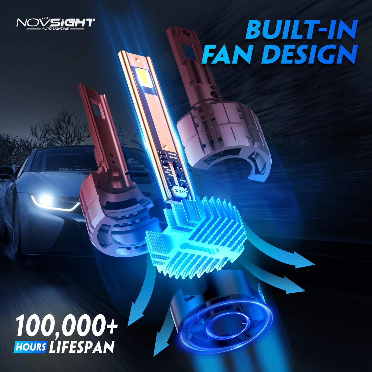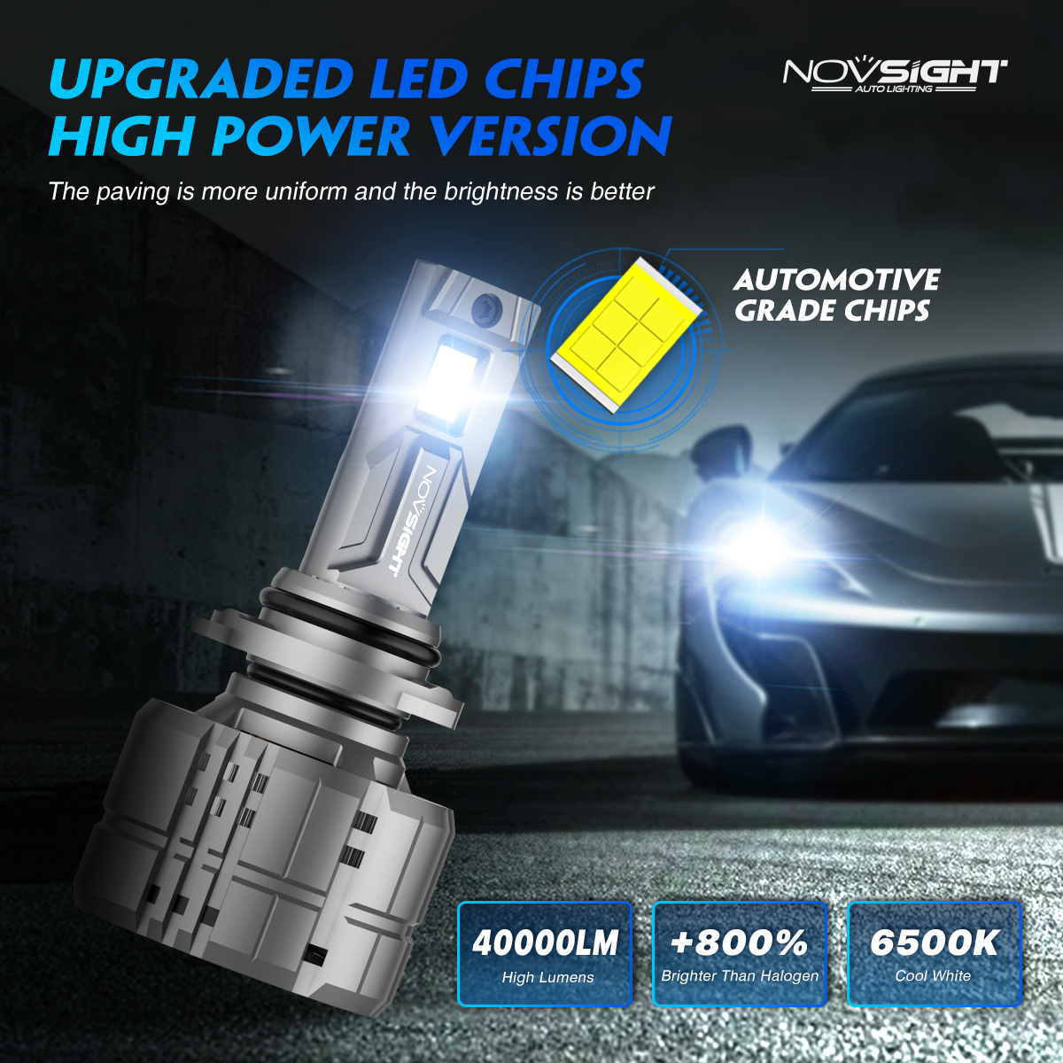 • Novsight N60 LED bulbs feature advanced lighting technology, 200 watts, 40,000 lumens of light output, giving you 900% of the light output. The brightest alternative to halogen bulbs..