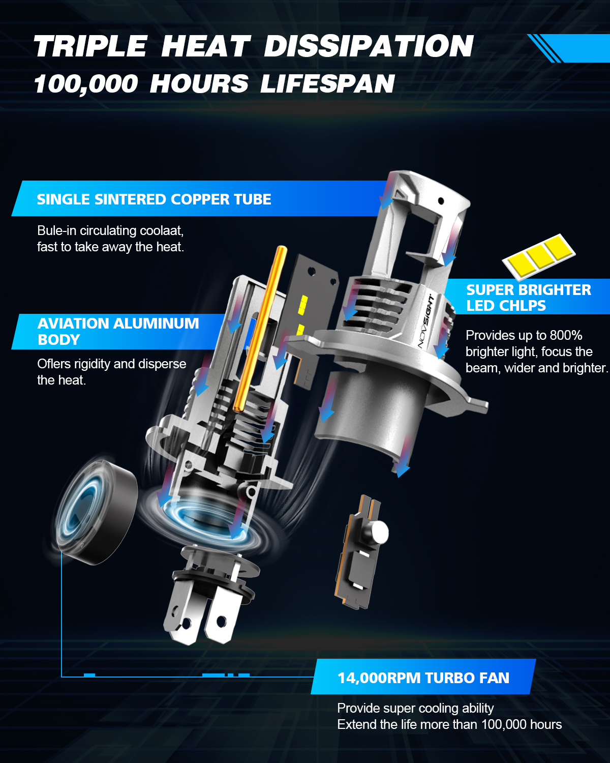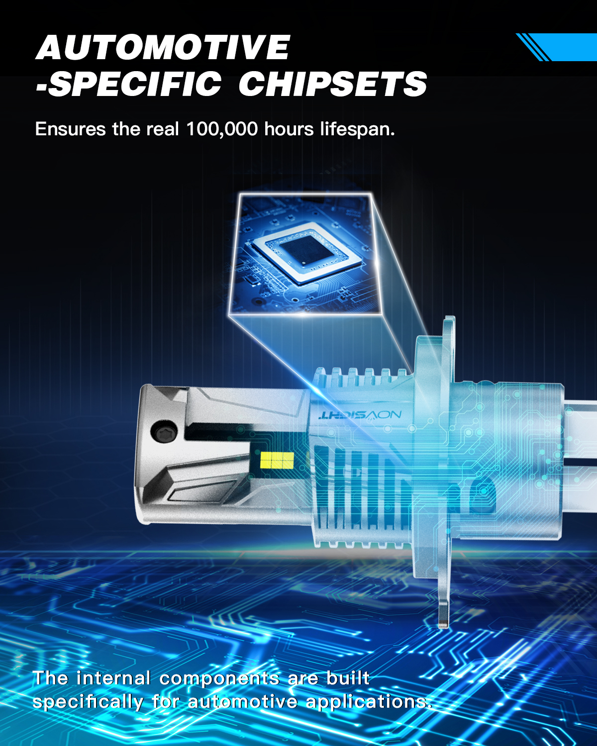 NOVSIGHT chipsets designed only for automotive use, ensure the real 100,000 hours lifespan because vehicles provide a harsh and demanding operating environment. Meanwhile, other brands may use off-the-shelf chipsets, which will create extreme heat and decreases lifespan..