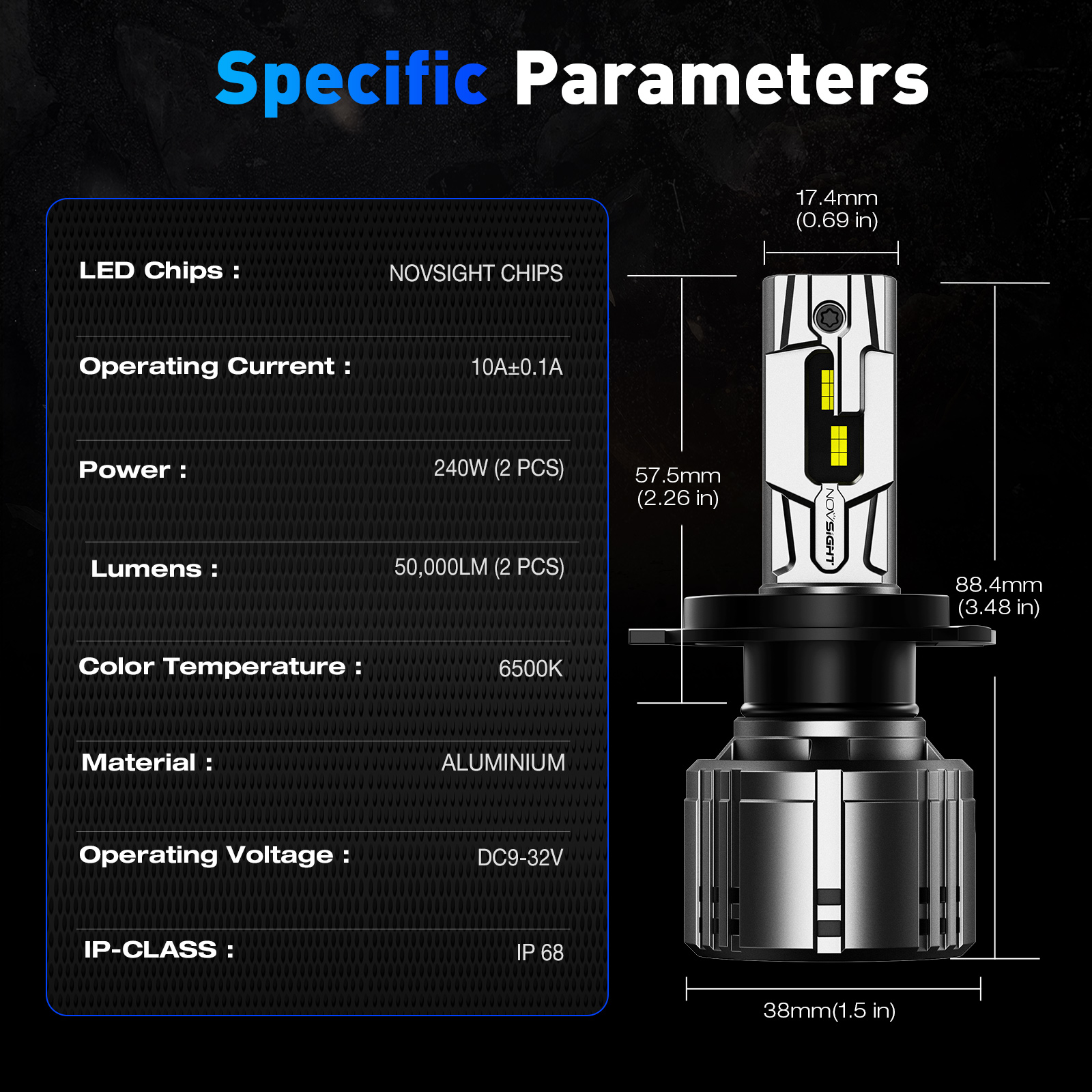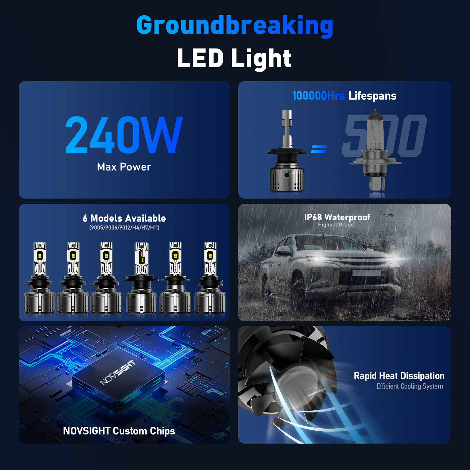 The Novsight T1 H11 LED Headlight delivers ultra-bright, high-clarity illumination for car low beam and fog light applications. With 50,000 lumens and 240W total output, this LED bulb creates a perfect 6500K beam pattern for maximum road visibility without blinding oncoming traffic..